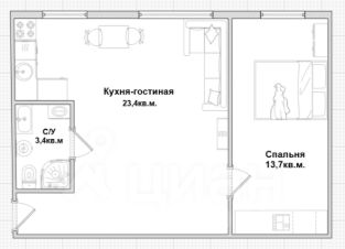 Удобная и современная евро-планировка: просторная гостиная, объединенная с кухней и отдельная изолированная спальня для уюта и приватности.